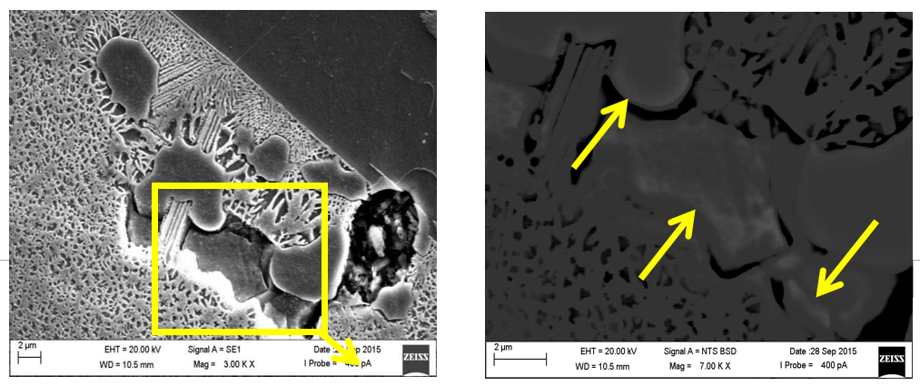 2. 二次电子下,头部试样共晶区形貌图,见左图;背散射下,共晶区有高亮衬度区,